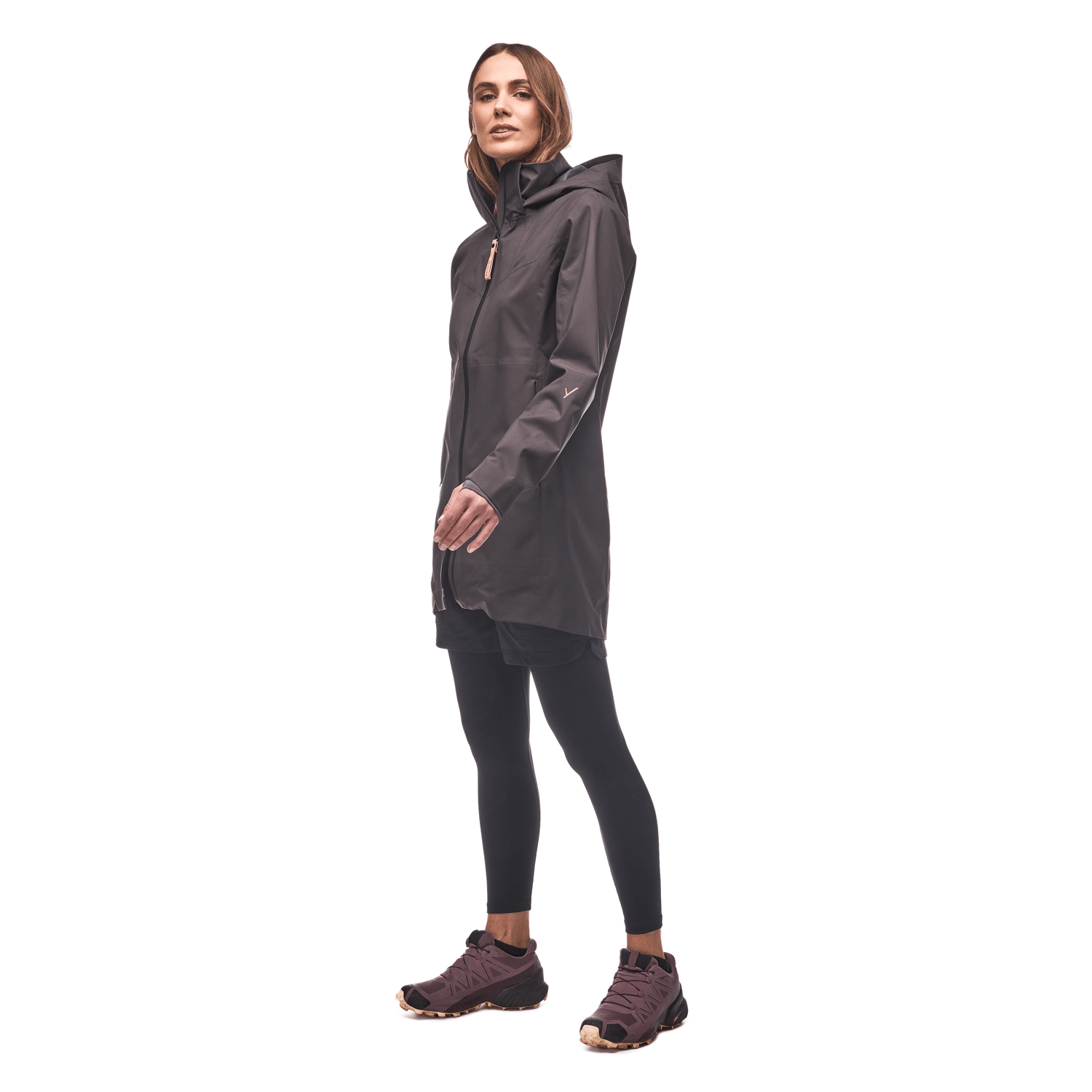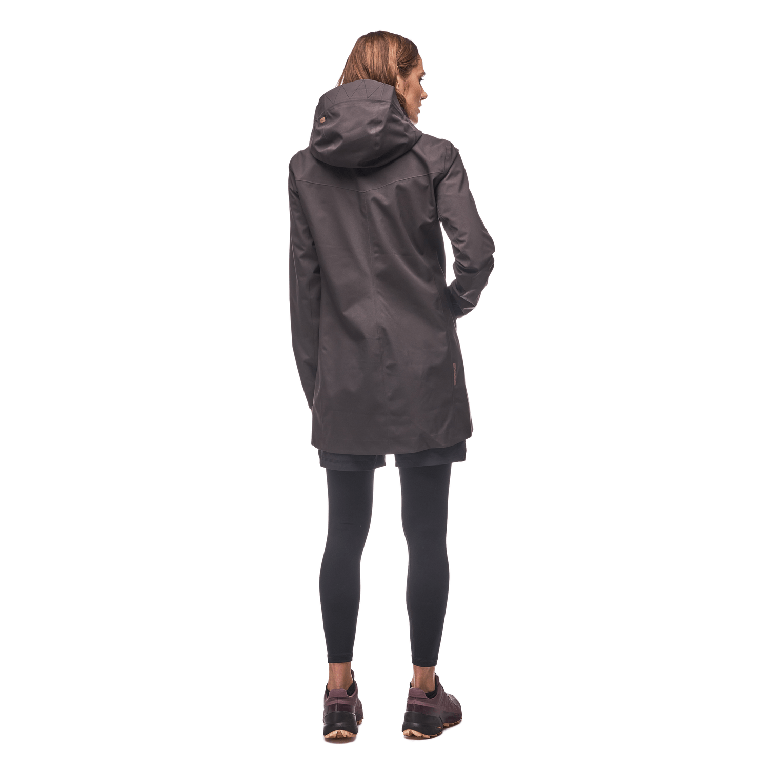 A hip-length hooded rain jacket with elastic cuffs and slim fit. This raincoat is functional and feminine-totally waterproof and breathable, with a form-fitting silhouette. Fully seam sealed